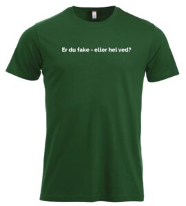 T-skjorte: Er du fake – eller hel ved? 99,00kr Størrelse Velg et alternativLargeMediumSmallX-largeXX-largeXXX-largeNullstill T-skjorte: Er du fake – eller hel ved? antall Kjøp Produktnummer: 1026 Kategori: Klær Stikkord: er du fake eller hel ved, T-skjorte Beskrivelse Tilleggsinformasjon Beskrivelse Unisexmodell Tilleggsinformasjon Størrelse Large, Medium, Small, X-large, XX-large, XXX-large